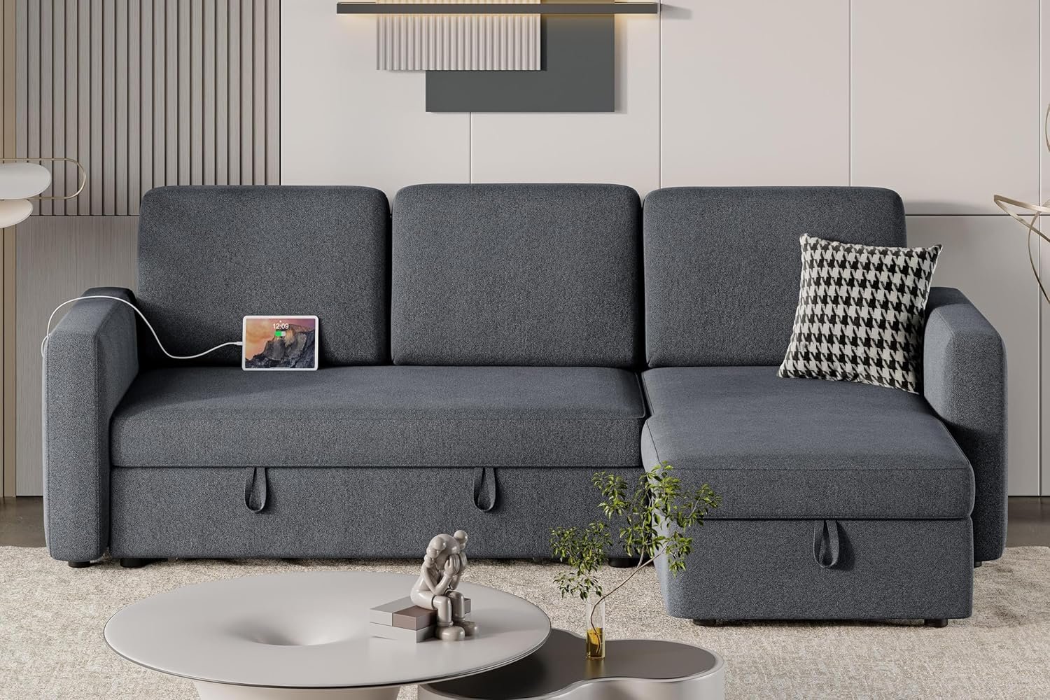 Sectional Sofa L-Shaped Sofa Couch Bed w/Chaise & USB, Reversible Couch Sleeper w/Pull Out Bed & Storage Space Living Room Dark Gray